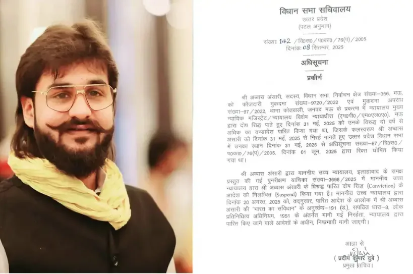 विधानसभा सचिवालय ने सोमवार शाम को आदेश जारी करते हुए कहा कि अब्बास अंसारी की सदस्यता उसी तारीख से बहाल मानी जाएगी, जब इसे रिक्त घोषित किया गया था। आदेश में संविधान के अनुच्छेद 191(1)(e) और लोक प्रतिनिधित्व अधिनियम, 1951 की धारा 8 का हवाला दिया गया।