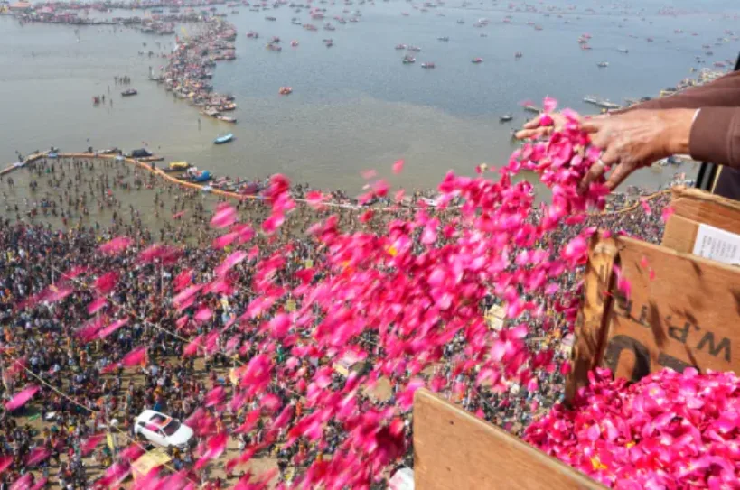 रविवार सुबह करीब 10 बजे संगम नोज पर एक अद्भुत दृश्य देखने को मिला। संगम में स्नान कर रहे श्रद्धालुओं पर हेलीकॉप्टर से पुष्पवर्षा की गई। जैसे ही फूलों की वर्षा शुरू हुई, श्रद्धालुओं ने जय श्रीराम और हर-हर गंगे के उद्घोष लगाए। दोपहर तक कई चरणों में पुष्पवर्षा की गई।