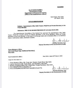 सरकारी आदेश के अनुसार, कैबिनेट की नियुक्ति समिति (ACC) ने IFS अधिकारी निधि तिवारी को पीएम मोदी की निजी सचिव बनाए जाने की स्वीकृति दी। 29 मार्च को जारी आदेश में कहा गया कि अब वे इस नए पद की जिम्मेदारी संभालेंगी।